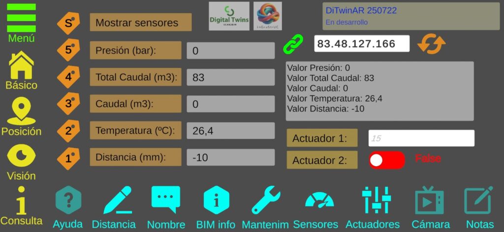 A lo largo de su ejecución, se ha desarrollado un modelo BIM completo a partir de nubes de puntos generadas mediante escáner láser, sobre el cual se ha implementado un sistema de monitorización en tiempo real de las condiciones de la instalación industrial mediante sensores y actuadores conectados: caudalímetros, sensores de presión, sensores de distancia para puente grúa y actuadores en forma de electroválvulas de bola. Estos datos se actualizan dinámicamente en el gemelo digital y pueden visualizarse desde una aplicación en Realidad Aumentada y Virtual, permitiendo al usuario inspeccionar el estado de la nave directamente sobre el entorno físico.